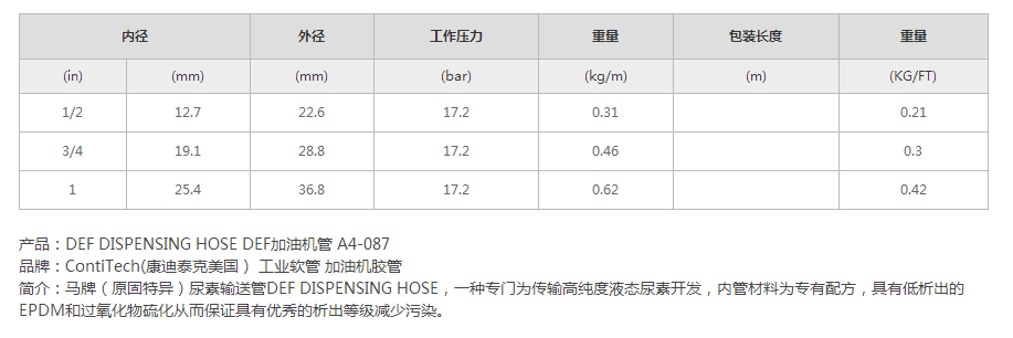 柴油廢氣分解流體(DEF:含32.5%高純度尿素去離子水用來分解氮的液體)是選擇性催化還原系統(tǒng)關鍵的成分之一,這種系統(tǒng)可以讓柴油車滿足自2010.1.1號生效的嚴厲的排放法規(guī)。DEF是種液體,可以作為一種催化劑加在燃油廢氣中將含有Nox煙霧轉化成無害的氮和水蒸氣。DEF加油機管是一種專門為傳輸高純度液態(tài)尿素開發(fā),內(nèi)管材料為專有配方,具有低析出的EPDM和過氧化物硫化從而保證具有析出等級減少污染。柔軟的構造可以提供使用和盤卷應用。具有導靜電的鋼絲也可提供。
