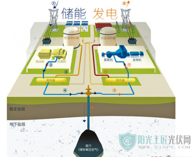 使用鹽穴來儲能發(fā)電在其他國家并非沒有先例,但采取“非補(bǔ)燃”技能卻是國內(nèi)首創(chuàng)。“鹽穴的高壓空氣被開釋出來后,需求加熱膨脹發(fā)生更大推力,此前國外已投運(yùn)的電站都經(jīng)過燃燒天然氣來加熱,‘補(bǔ)燃’進(jìn)程會發(fā)生碳排放?!泵飞鷤ソ榻B,金壇項(xiàng)目將壓縮空氣進(jìn)程中發(fā)生的熱能貯存起來,發(fā)電時(shí)再將熱能開釋,將電能轉(zhuǎn)化效率提升至60%以上。據(jù)測算,該項(xiàng)目全年可節(jié)省標(biāo)準(zhǔn)煤3萬噸,削減二氧化碳排放超6萬噸。
